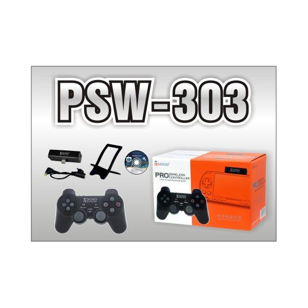 DOSO PSW 303 es un mando inalámbrico por tu PSP, incluye un mando inalámbrico,un receptor de USB, un cable, una soporta para tu PSP y un CD de instrucción.